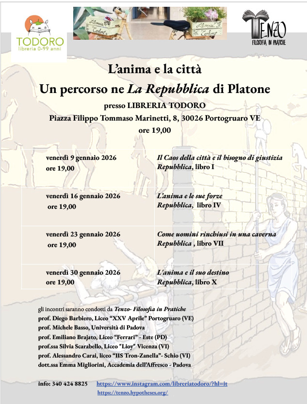 Iniziativa di Associazione Tenzo-filosofie in pratiche in collaborazione con la libreria Todoro di Portogruaro. Un ciclo di 4 lezioni dedicate a "La Repubblica" di Platone.