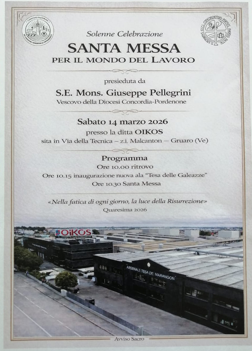 Sabato 14 marzo alle 10, presso l’azienda OIKOS a Gruaro, si terrà la Solenne Messa per il mondo del lavoro presieduta dal vescovo Giuseppe Pellegrini. Prevista anche l’inaugurazione della nuova ala “Tesa delle Galeazze”