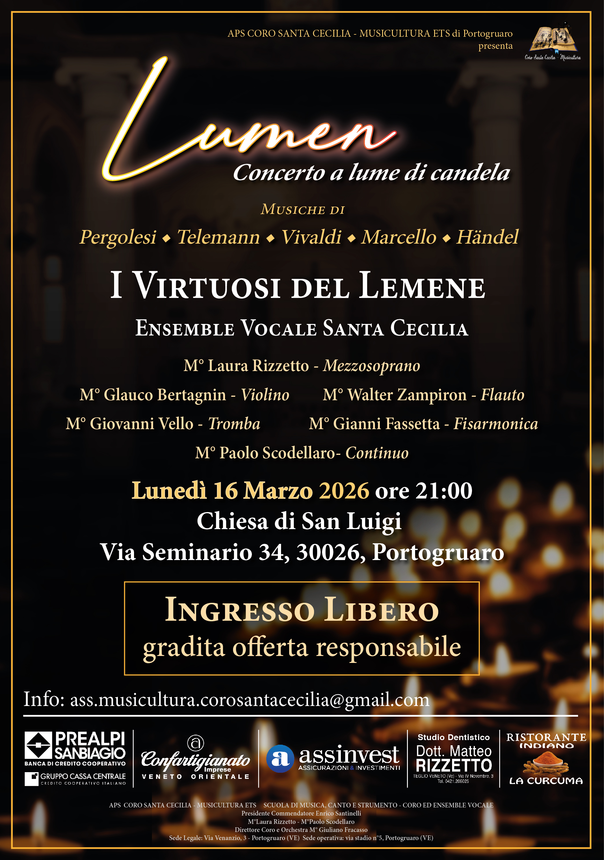 Una serata immersa nella luce calda delle candele, pensata per valorizzare il repertorio barocco attraverso le musiche di Pergolesi, Telemann, Vivaldi, Marcello e Caccini.