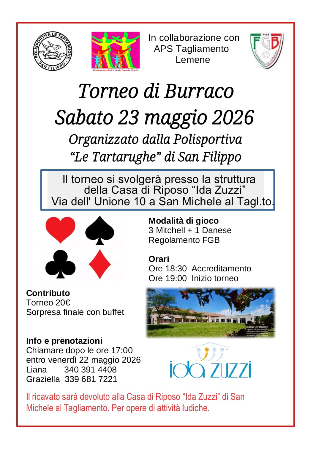 Il ricavato verrà devoluto in favore della struttura "Ida Zuzzi" per sostenere le attività ludiche dedicate agli ospiti della casa di riposo.