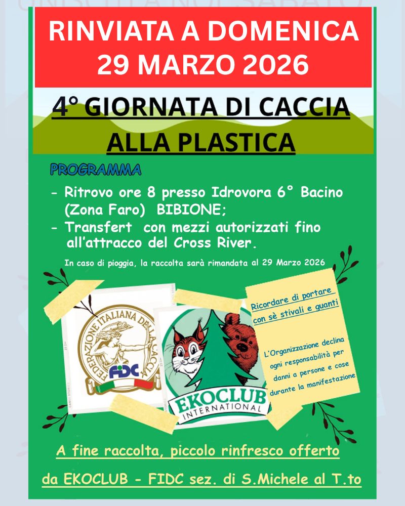 L'Associazione Federcaccia sezione San Michele al Tagliamento unitamente all'Ekoclub invitano quanti siano interessati a partecipare alla 4^ Giornata di Caccia alla Plastica. Ritrovo alle ore 08:00, portare con sé stivali e guanti adatti.
