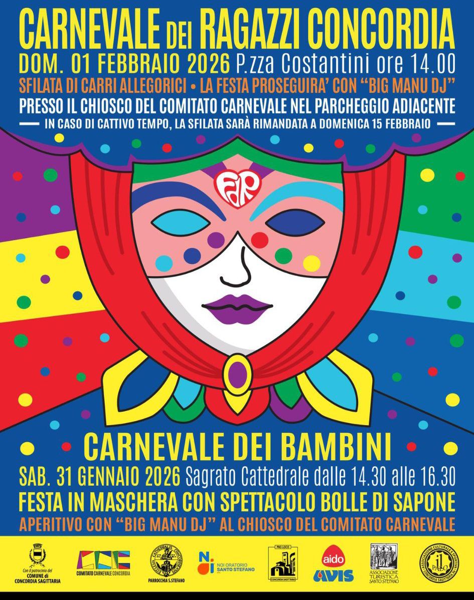 È già tempo di Carnevale a Concordia Sagittaria, dove con la solita trepidante attesa ci si sta preparando a un weekend di festa: il Carnevale dei Ragazzi 2026 quest'anno si compone di tre grandi, allegri, colorati appuntamenti dedicati al divertimento, alla musica e alla tradizione!