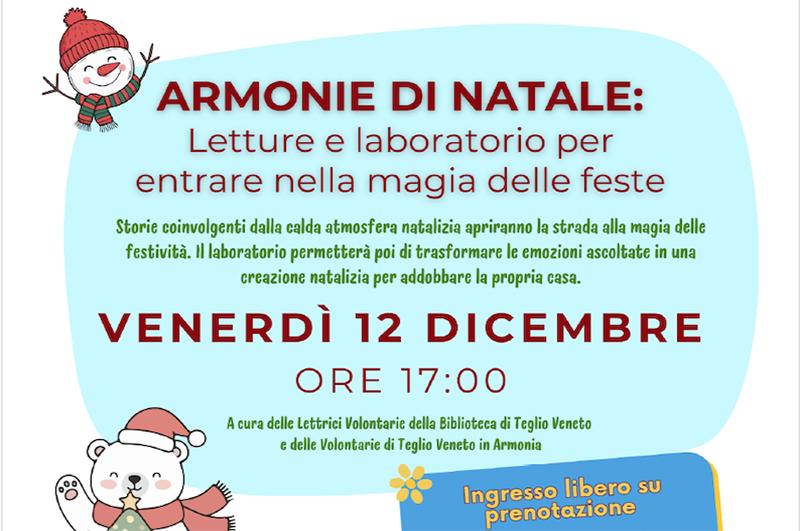 Venerdì 12 dicembre, alle ore 17.00, presso la Biblioteca Comunale di Teglio Veneto, andrà in scena "Armonie di Natale: letture e laboratorio per entrare nella magia delle feste": un appuntamento coinvolgente e aperto a tutte le famiglie per cominciare a entrare nella calda ed elettrizzante atmosfera natalizia grazie a letture e laboratori a cura delle Lettrici Volontarie della Biblioteca e delle Volontarie di Teglio Veneto in Armonia.