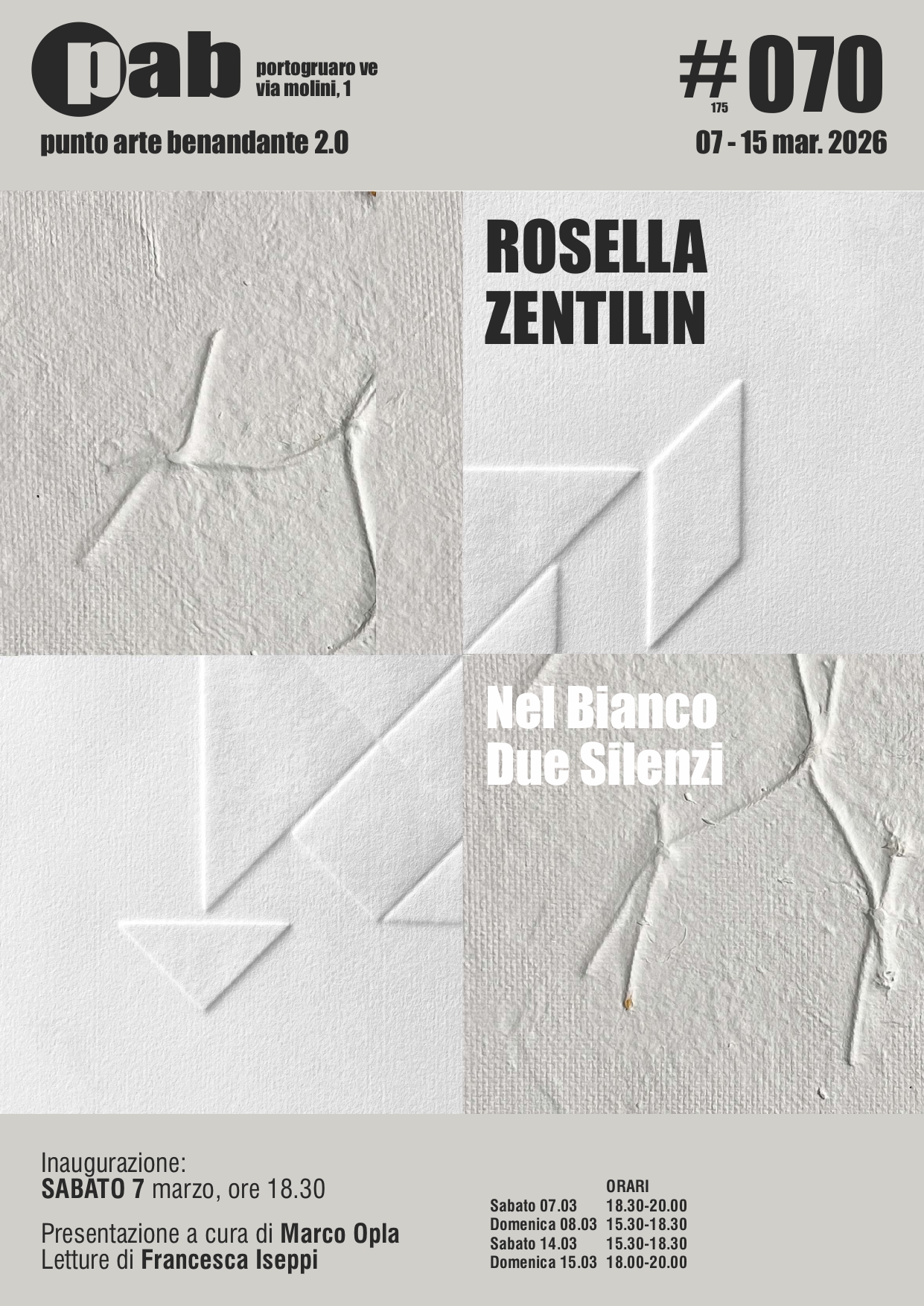 Un dialogo fatto di luce, sospensione e interiorità. Si presenta così “Nel bianco due silenzi”, la nuova mostra dell’artista Rosella Zentilin, che sarà inaugurata sabato 7 marzo alle 18.30 negli spazi della Galleria PAB – Punto Arte Benandante 2.0, in via Molini 1.