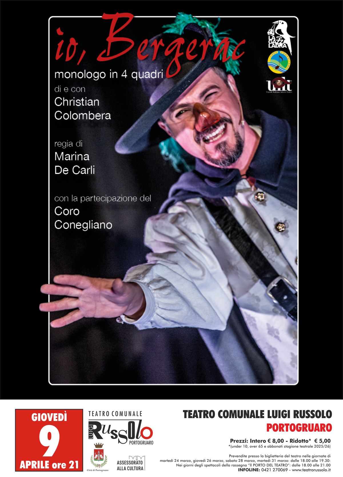 Giovedì 9 aprile, alle ore 21.00, andrà in onda al Teatro Russolo il secondo appuntamento del cartellone "Il Porto del Teatro": dopo il debutto della compagnia Cibìo - Pro Loco di Chions A.P.S., è la volta de la Gazza Ladra A.P.S. di Portogruaro, che porta in scena una produzione dal titolo "Io, Bergerac", una libera interpretazione della celebre tragicommedia francese. Lo spettacolo si sviluppa come in monologo in quattro quadri scritto e interpretato da Christian Colombera; la regia è affidata a Marina De Carli e vedrà la partecipazione del Coro Conegliano diretto da Diego Tommasi.