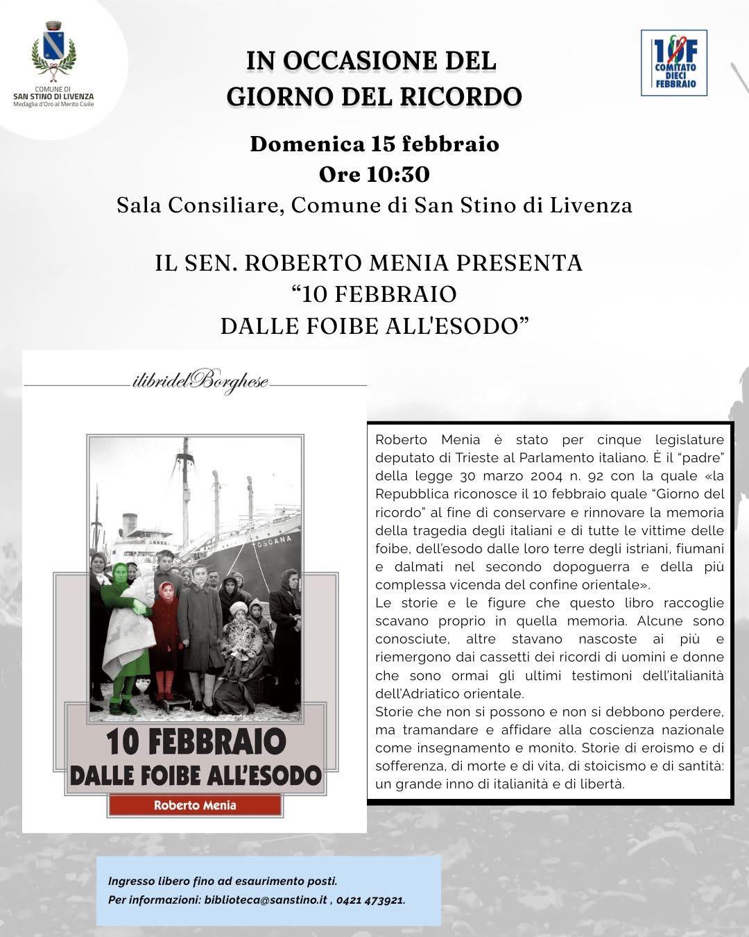 Il Comune di San Stino di Livenza celebra il Giorno del Ricordo con un appuntamento di alto valore istituzionale e culturale. Domenica 15 febbraio, alle ore 10.30, la Sala Consiliare ospiterà la presentazione del volume “10 Febbraio. Dalle foibe all’esodo” dell’Onorevole Roberto Menia, promotore della legge che ha istituito il Giorno del Ricordo.