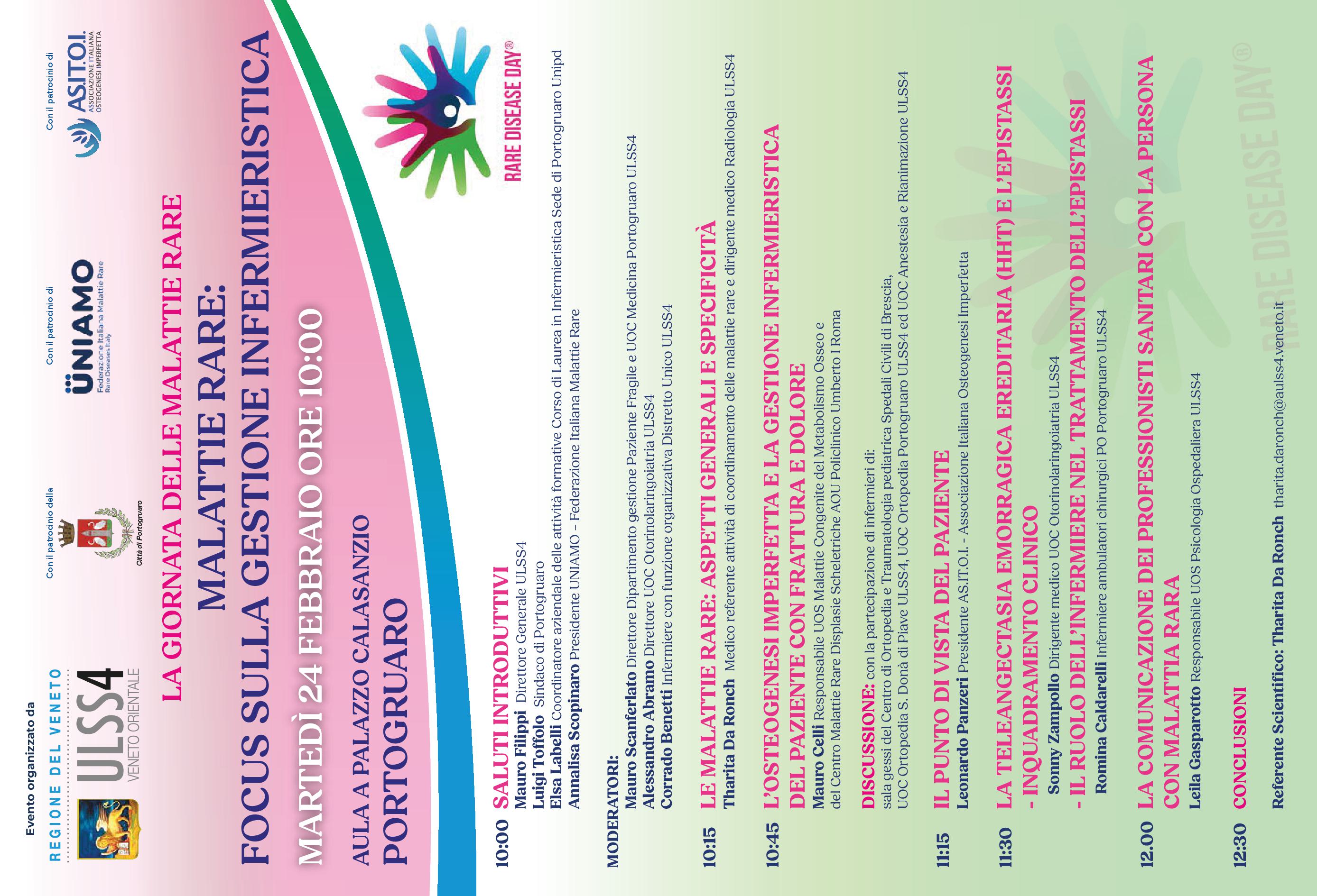Nella mattinata di studio interverranno professionisti dell'ULSS 4, del Policlinico Umberto I di Roma, degli “Spedali Civili di Brescia”, interverranno inoltre esponenti di associazioni di pazienti e i vertici della Federazione Italiana Malattie Rare (UNIAMO) promotrice in Italia della campagna di sensibilizzazione per la Giornata delle Malattie Rare.