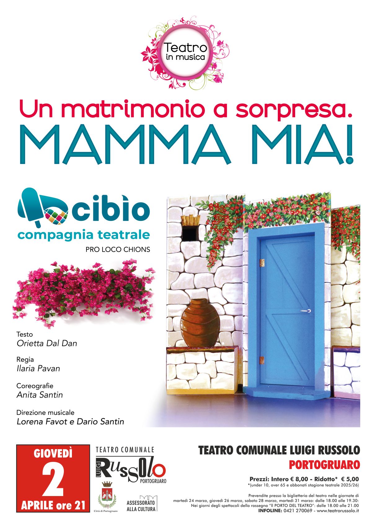 Il Teatro Comunale Luigi Russolo di Portogruaro è pronto ad aprire il sipario alle compagnie teatrali locali! Giovedì 2 aprile alle ore 21 va infatti in scena il primo spettacolo del cartellone “Il Porto del Teatro”: la compagnia Cibìo – Pro Loco di Chions A.P.S. presenta il musical “Un matrimonio a sorpresa. Mamma Mia!”, testo Orietta Dal Dan, regia Ilaria Pavan, coreografie Anita Santin, direzione musicale Lorena Favot e Dario Santin.