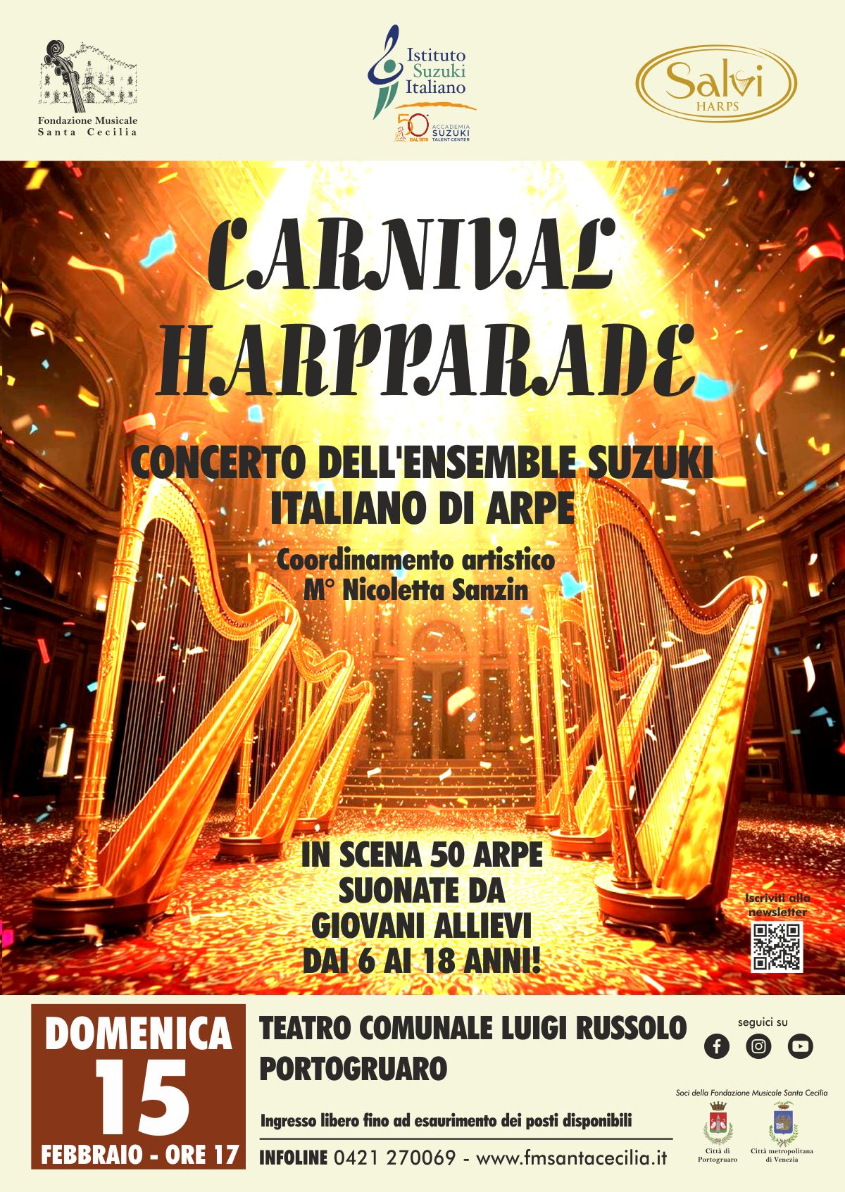 Visto che si tratta della domenica che anticipa il martedì grasso, tutti i giovani musicisti saranno vestiti in maschera e presenteranno un concerto gioioso e originale: Carnival HarpParade! Il coordinamento artistico è della Prof.ssa Nicoletta Sanzin, docente di arpa presso la Fondazione Musicale Santa Cecilia.