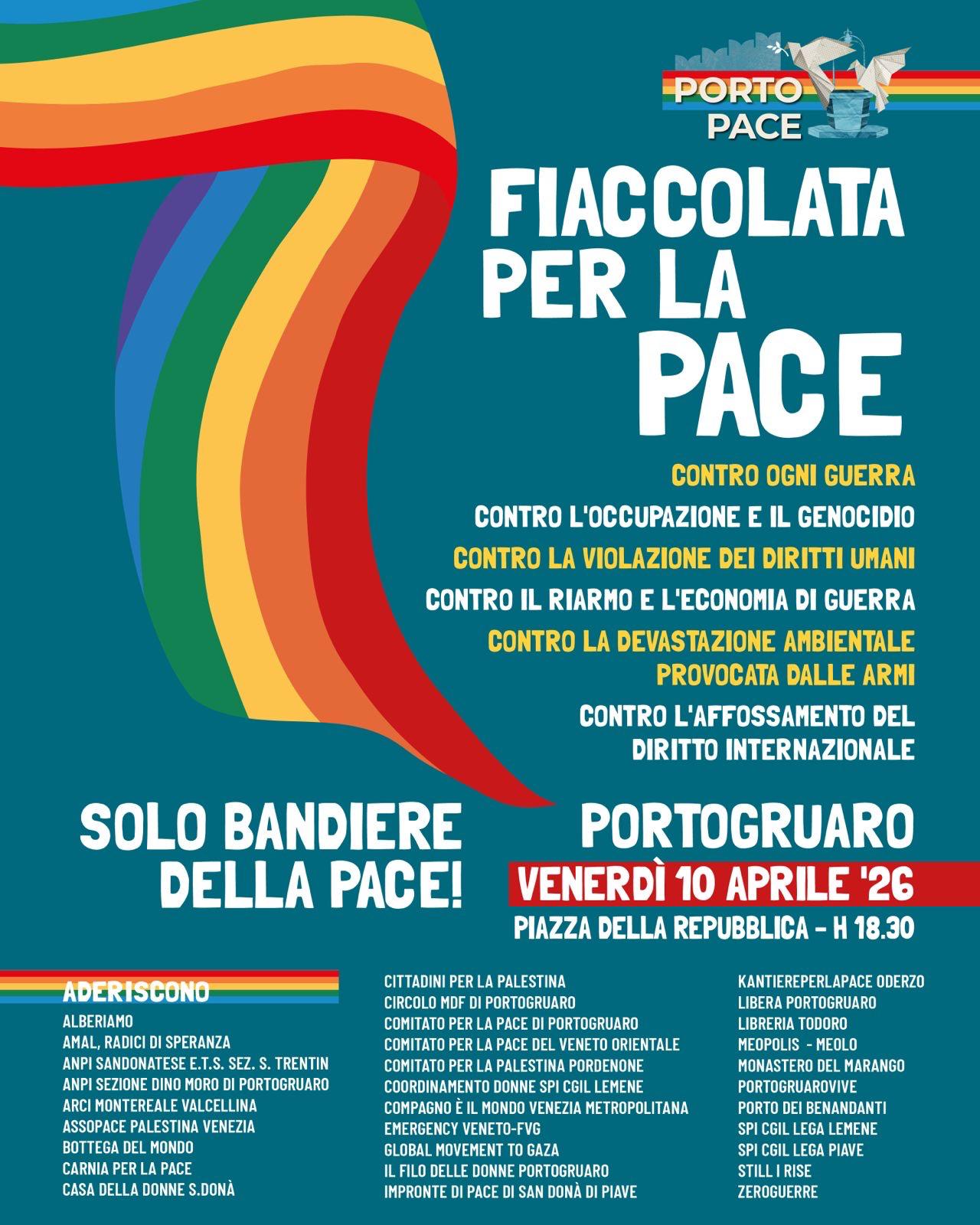 Venerdì 10 aprile 2026 le vie di Portogruaro verranno illuminate, simbolicamente e concretamente, dalla speranza di una ritrovata pace: l'appello che viene lanciato da Cittadini per la Palestina a tutta la cittadinanza è quello di prendere parte alla Fiaccolata per la Pace, che vede l'adesione di oltre trenta associazioni della zona, non solo Portogruaro, ma anche da Carole a Venezia e da Oderzo a Pordenone, tutte unite attorno alla volontà di far sentire la voce di tanta parte della società civile che si oppone fermamente all'orrore che si sta compiendo davanti ai nostri occhi impotenti.