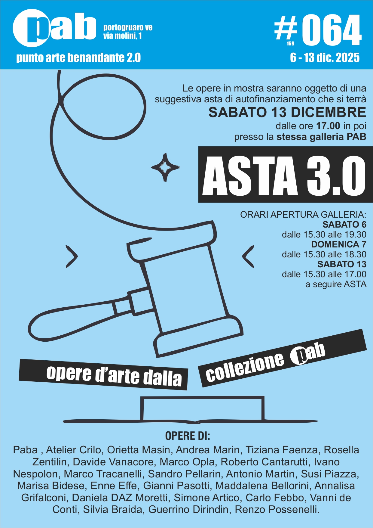 Le opere d'arte in mostra sabato 6 e domenica 7, direttamente dalla collezione pab, saranno poi oggetto di una suggestiva asta di autofinanziamento che si terrà sabato 13 dalle 17.00 in poi.