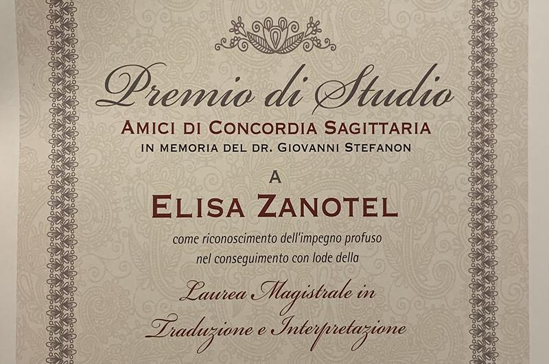 Sabato 29 novembre l'Associazione "Amici di Concordia Sagittaria" ha consegnato per l'undicesima volta il Premio di Studio alla memoria del defunto Dott. Giovanni Stefanon, storico presidente dell'associazione che da 70 anni promuove iniziative finalizzate a valorizzare la comunità locale. Dal 2015, ogni anno i membri dell'associazione selezionano e premiano uno studente universitario concordiese particolarmente meritevole per il curriculum di studio e per aver conseguito la laurea magistrale con il massimo dei voti.