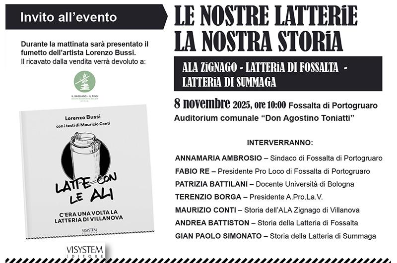 Chiuderà la giornata la presentazione di un fumetto dell’artista portogruarese Lorenzo Bussi che, in trenta tavole con commento a fronte, ha raccontato la storia dell’ALA in un lavoro intitolato “LATTE CON LE ALI” edito per i tipi di VISYSTEM.