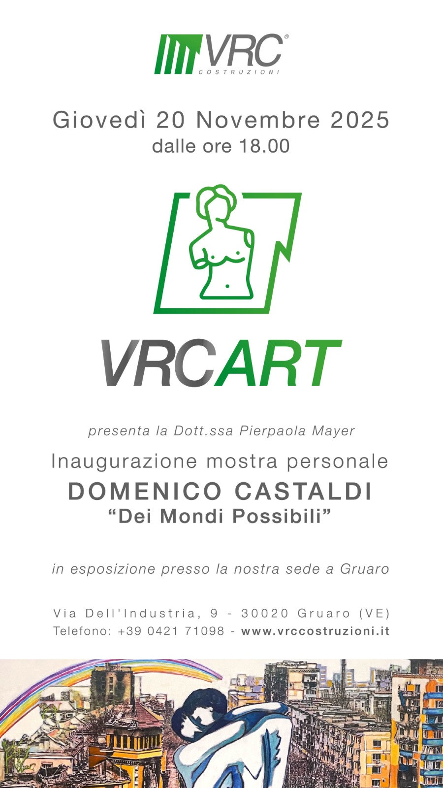 Da giovedì 20 novembre gli spazi della sede di Gruaro di "Veneziana Restauri Costruzioni (VRC)" saranno animati dalle opere di Domenico Castaldi. Alle ore 18.00 si terrà l'inaugurazione della mostra "Dei mondi possibili", durante la quale la dottoressa Pierpaola Mayer, direttrice del Distretto Turistico Venezia Orientale, guiderà i presenti alla scoperta delle opere.