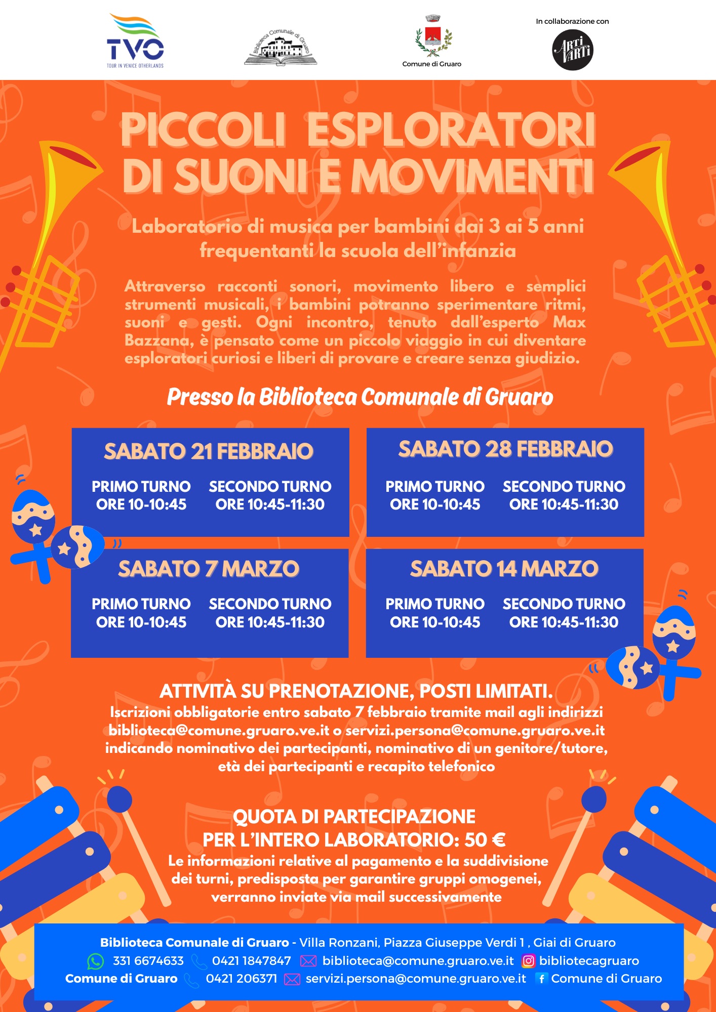 Il laboratorio sarà condotto da Max Bazzana, membro dell’associazione teatrale Artivarti, da anni impegnata in progetti artistici e performativi dedicati all’infanzia. Le attività si svolgeranno presso la Biblioteca Comunale di Gruaro, con due turni per ciascuna giornata. La partecipazione è su prenotazione e i posti sono limitati. Le iscrizioni sono obbligatorie entro sabato 7 febbraio.