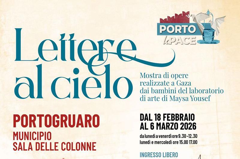 La seconda mostra si intitola "Lettere al cielo" e sarà ospitata nella splendida cornice della Sala delle colonne del Municipio, su concessione del Comune di Portogruaro, dal 18 febbraio al 6 marzo. I protagonisti, in questo caso, sono i bambini palestinesi: la mostra è costituita da una folta raccolta di immagini e parole che loro stessi rivolgono al cosmo affinché le loro preghiere trovino ascolto. Si tratta di opere figurative nate nel laboratorio d'arte dell'artista Maysa Yousef e che sono state in grado di ridare colore a ciò che è rimasto del suo atelier: una piccola stanza grigio polvere rimasta in piedi fra brandelli di muro e macerie. Mercoledì 18 febbraio, alle ore 15.30 si terrà l'inaugurazione dell'esposizione "Lettere dal cielo", presentata da Pietro Battistella, curatore della mostra di Marango.