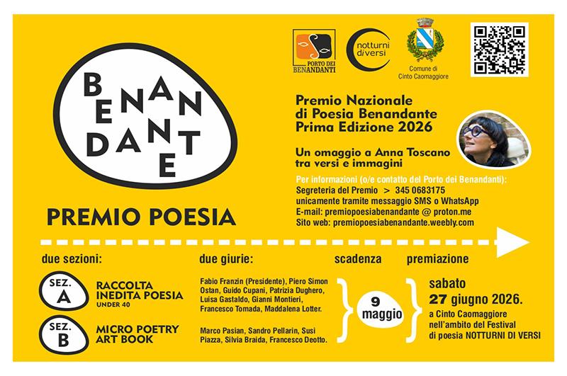 La scadenza per partecipare al Premio Nazionale di Poesia Benandante e mandare le proprie creazioni è fissata per il 9 maggio 2026, si invita visitare il sito e leggere con attenzione il bando del concorso, dove è possibile consultare tutti i dettagli e le informazioni fondamentali sui premi e sulle modalità di partecipazione: https://premiopoesiabenandante.weebly.com/bando-2026.html.