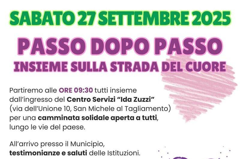 Per “non dimenticare chi dimentica”, sabato 27 settembre sarà possibile prendere parte a “Passo dopo passo, insieme sulla strada del cuore”, una camminata solidale per le vie del centro di San Michele al Tagliamento in compagnia degli ospiti della Casa di Riposo “Ida Zuzzi”, dei loro familiari e degli operatori, con partenza alle 09:30 proprio dalla sede della struttura residenziale, in via dell’Unione 10.