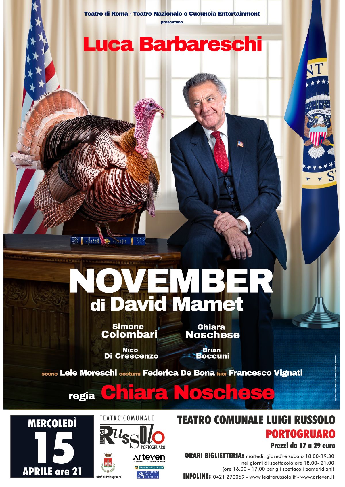 Scritto nel 2007, nel pieno della grande recessione, November è una satira feroce e divertente, un affresco esilarante di un Paese in crisi, dove il sogno americano diventa la giustificazione per ogni mezzo, anche il più discutibile. La commedia non solo esplora la corruzione e la manipolazione che segnano la politica, ma anche la fragilità di un sistema che, pur di mantenere il potere, è disposto a sacrificare ogni principio morale.