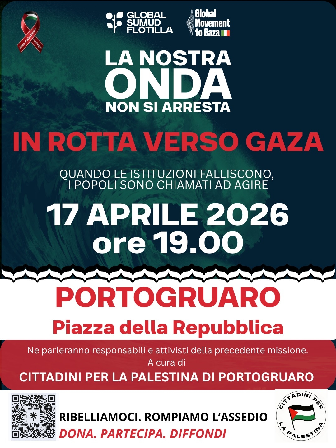 Il gruppo Cittadini per la Palestina di Portogruaro ha aderito all'iniziativa della Global Sumud Flotilla e intende far parte dell'equipaggio di terra.