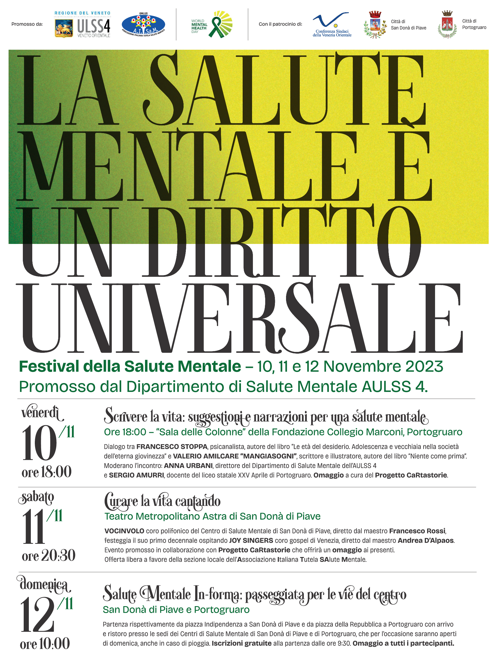 Il programma prevede venerdì 10 novembre alle ore 18.00 il primo evento “Scrivere la vita: suggestioni e narrazioni per una salute mentale”. Nella “Sala delle Colonne” del Collegio Marconi di Portogruaro ci sarà un dialogo tra due autori di libri a tema, ossia tra lo psicanalista Francesco Stoppa, autore de “Le età del desiderio. Adolescenza e vecchiaia nella società dell’eterna giovinezza” e Valerio Amilcare “Mangiasogni” autore di “Niente come prima”. Modereranno il confronto il direttore del Dipartimento di Salute Mentale dell’Ulss 4 e il docente del Liceo XXV Aprile di Portogruaro, rispettivamente Anna Urbani e Sergio Amurri.